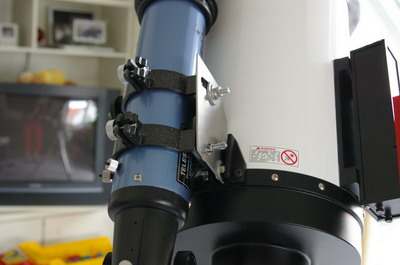 Damit der Skywatcher auf die Hauptoptik montiert werden konnte, habe ich die bestehende Halterung des Suchers umgebaut und mit einer Metallplatte die Verbindung hergestellt. Der Refraktor ist nun, leider aber nur in eine Richtung gegenüber der Hauptoptik schwenkbar