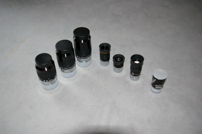 Derzeit habe ich je 2" Okulare mit 8- 24 mm, 32, und 42 Brennweite sowie 1 1/4" Okulare 9, 15 und 26 mm Brennweite. Dazu gesellt sich noch eine 3 fach Barlowlinse, die aber so gut wie nie genutzt wird.